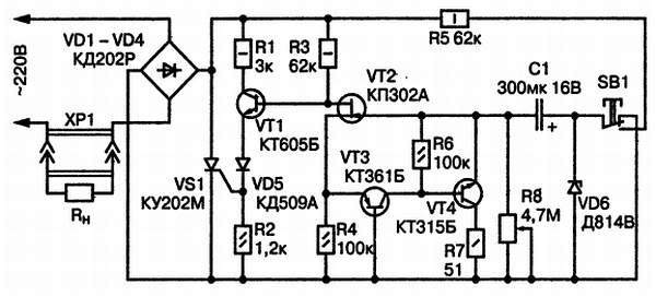 После нажатия кнопки SB1 конденсатор С1 через резистор R5 и переходы транзисторов VT2, VT3 заряжается до напряжения стабилизации VD6. При отпускании кнопки на левой обкладке С1 появляется отрицательный потенциал. Транзисторы VT2-VT4 запираются положительным потенциалом на стоке VT2 и базе VT1. VT4 подает отпирающее напряжение на управляющий электрод тиристора. Конденсатор С1 разряжается через резистор R8, сопротивление которого определяет скорость разряда. Когда напряжение на С1 достигнет напряжения отсечки VT2, последний откроется скачком за счет положительной обратной связи через транзисторы VT3, VT4. Потенциал стока VT2 упадет, VT1 и VS1 запрутся, нагрузка обесточится, установится исходное состояние реле.