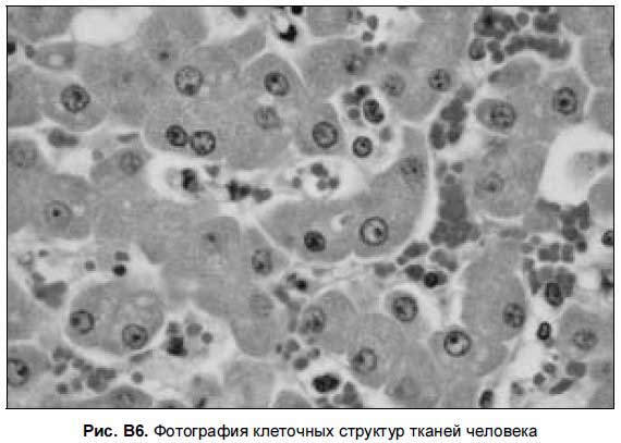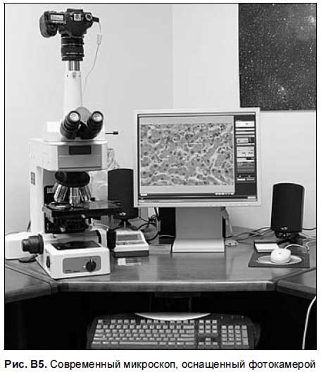 Сочетание фотоаппарата и микроскопа позволяет документировать события микромира (рис. В7), позволяя затем их рассматривать большому количеству людей. Фотографии клеточных структур или мазков крови позволяют врачам поставить правильный диагноз, учиться на фотографиях поврежденных тканей, редких заболеваний и даже опасных (рис. В8).