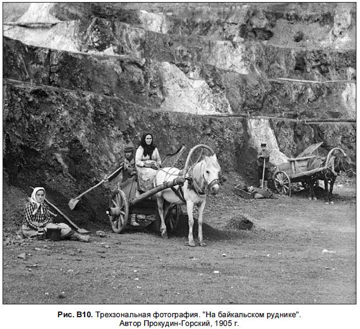 Интересен метод, который Прокудин-Горский использовал для получения цветных фотографий. В начале века цветных фотоматериалов еще не существовало, поэтому он использовал обычные черно-белые фотопластинки и специальный фотоаппарат (собственной конструкции), который быстро делал три снимка одного и того же сюжета через три различных светофильтра — синий, зеленый и красный. С полученной фотопластинки изготавливался диапозитив (точнее, три диапозитива на одной пластинке один над другим — «синий», «зеленый» и «красный»), которые проецировались на экран специальным диапроектором — каждый диапозитив через свой светофильтр соответствующего цвета. В результате на экране получалось цветное изображение. Возможно, что показы фотографий Прокудина-Горского были первыми в мире демонстрациями слайдов (рис. В10).
