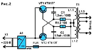 Это симметричный мультивибратор, в плечах которого работают транзисторы VT1, VT2 и половины первичной обмотки L1 трансформатора Т1. Частота генерации задается конденсаторами C1, С2 и резисторами R1, R2. Трансформатор наматывается на тороидальном пермаллоевом сердечнике с размерами 50x35x6 мм; первичная обмотка содержит 80 витков (с отводом от середины) провода ПЭВ-2 0,61, повышающая вторичная — порядка 1200 витков провода ПЭВ-2 0,1 с отводами от 800 и 1000 витков (для возможности подбора выходного напряжения).