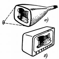 Рис. 175. Передаваемое изображение с помощью объектива проецируют на светочувствительную поверхность передающей электронно-лучевой трубки (а). Телевизионный приемник оснащен электронно-лучевой трубкой с люминесцентным экраном (б).