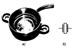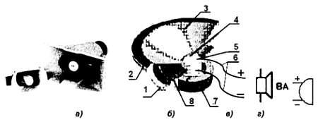 а — внешний вид;б — вид в разрезе (1 — диффузородержатель; 2 — подвес; 3 — диффузор; 4 — пылезащитный колпачок; 5 — звуковая катушка: 6 — гибкие выводы; 7 — магнит; 8 — центрирующая шайба); в — УГО; г — компонент EWB