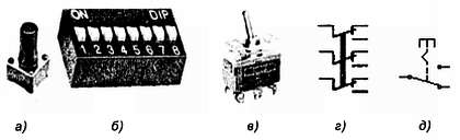 а — микропереключатель; б — DIP-переключатель; в — тумблер; г — УГО многополюсного переключателя; д — компонент EWB