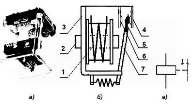 а— внешний вид;б — устройство (1 — катушка; 2 — сердечник; 3 — ярмо; 4 — Н3; 5 — переключающий контакт; 6 — HP; 7 — толкатель); в — компонент EWB