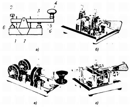 а — классический ключ (1 — подставка; 2 — задний контактный винт; 3 — двуплечий рычаг; 4 — рукоятка ключа; 5 — передний контакт; 6 — плоские стальные контактные пружины с серебряными контактными напайками; 7 — пружины); б — телеграфный манипулятор «Альманах-ПРО» Мастер КИТ MK327; в — телеграфный манипулятор «Эклипс» MK328; г — телеграфный манипулятор «Зеро» MK329