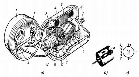 а — вид в разрезе (1, 6 — подшипниковые щиты; 2 — щетки; 3 — обмотка возбуждения; 4 — корпус; 5 — статор; 7 — вал; 8 — сердечник якоря; 9 — полюс; 10 — обмотка якоря; 11 — коллектор; 12 — подшипник); б — микродвигатель; в — компонент EWB