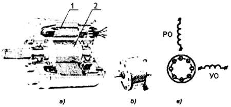 а — вид в разрезе (1 — обмотки статора; 2 — ротор); б — микродвигатель;в — УГО (РО — рабочая обмотка; УО — управляющая обмотка)