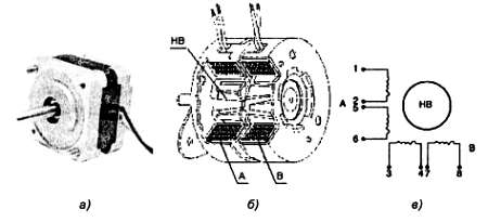 а — общий вид; б — схема (А, В — управляющие обмотки; НВ — ротор)