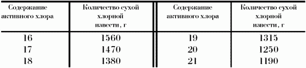 Примечание: при содержании активного хлора в исходном сухом препарате (хлорамин, хлорная известь) менее 16 % он подлежит изъятию из употребления.