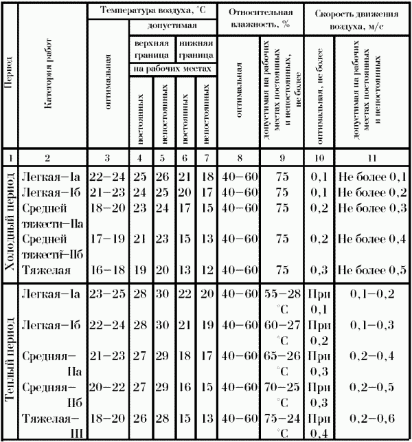 Нормируемые величины температуры, относительной влажности и скорости движения воздуха в рабочей зоне производственных помещений
