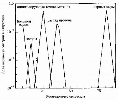 Рис. 22. На данном рисунке вклад, который различные процессы вносят в фоновое излучение Вселенной, изображен как функция времени для космологических декад от пятой до девяностой. Вертикальная ось представляет относительную энергию в излучении от нескольких источников: излучения, оставшегося от первичной Вселенной, света звезд, аннигиляции темной материи, распада протона и испарения черных дыр