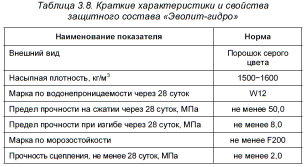 «Эволит-гидро» не токсичен, пожаро- и взрывобезопасен. Цементно-песчаный состав проникающего действия «Эволит-гидро» применяется при устройстве горизонтальных отсечек, уплотнении рабочих швов при бетонировании и сопряжении элементов конструкций, заделке трещин, пустот, раковин и мест врезки коммуникаций. Состав может использоваться в виде связующего высокоадгезионного грунтовочного покрытия при устройстве многослойных конструкций (табл. 3.8).