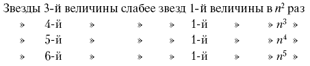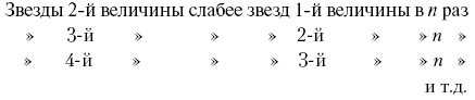 Шкала звездного блеска установлена так, что отношение блеска звезд двух смежных величин остается постоянным. Обозначив это «световое отношение» через n, имеем: