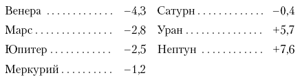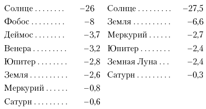 Далее приводим оценку блеска светил на небе Венеры, Марса и Юпитера без новых пояснений, так как они представляют собой лишь количественное выражение того, о чем говорилось уже в разделе «Чужие небеса».