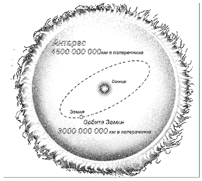 Рис. 73. Звезда-гигант Антарес (а Скорпиона) могла бы включить в себя наше Солнце с земной орбитой