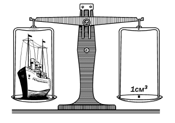 Рис. 77. Один кубический сантиметр атомных ядер мог бы уравновесить океанский пароход и при весьма неплотной упаковке их. Плотно же уложенные в объеме 1 см3 атомные ядра весили бы 10 миллионов тонн!