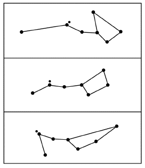 Рис. 78. Фигуры созвездий медленно меняются с течением времени. Средний рисунок изображает «ковш» Большой Медведицы в настоящее время, верхний – 100 тыс. лет назад, нижний – через 100 тыс. лет после нашего времени