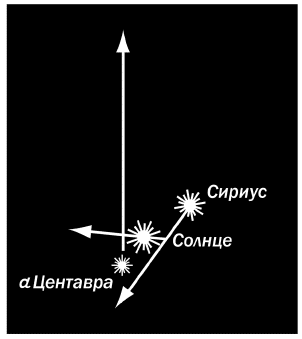 Рис. 79. Движение трех звезд – нашего Солнца, звезды а Центавра и Сириуса.