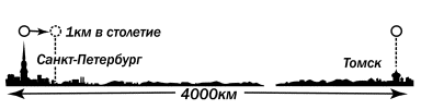Рис. 80. Масштаб звездных движений; Два крокетных шара, один в Петербурге, другой в Томске, движутся со скоростью 1 км в столетие – вот уменьшенное подобие сближения двух звезд. Из этого ясно, как ничтожна вероятность столкновений между звездами