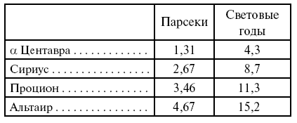 Вот расстояния нескольких ярких звезд, выраженные в парсеках и световых годах: