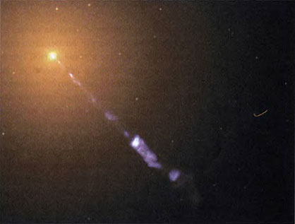 12.2. Явление, непосредственно связанное с одним из решений общей теории относительности, найденных аналитически (решение Керра для вращающейся черной дыры): джет ядра галактики М87. Это релятивистская струя замагниченной плазмы, индуцируемая непосредственно вращающейся черной дырой, погруженной во внешнее магнитное поле. Именно эта черная дыра, возможно, будет первой, которую удастся «разглядеть» с помощью микроволновых космических интерферометров. На данном снимке для этого не хватает пяти порядков по разрешению. Снимок космического телескопа «Хаббл» (NASA)