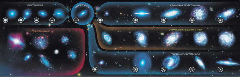 Согласно наиболее распространённой схеме классификации по внешнему виду и структуре, предложенной Э. Хабблом, галактики принято относить к одному из четырех морфологических типов.