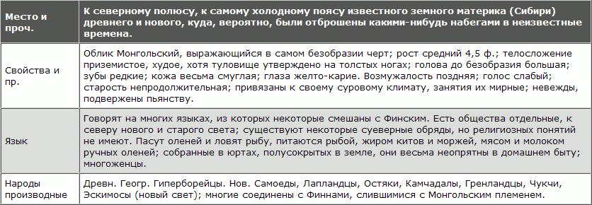 Общие признаки. Лицевой угол от 76 до 85°; голова большая, шарообразная, лицо плоское, угловатое, скуластое; нос малый, плоский; глаза черные, малые, поднятые к вискам; веки толстые, рот большой, губы толстые; подбородок острый, борода редкая; уши большие, отдаленные от головы, кожа желто-оливковая, волосы черные, толстые, редкие, хотя длинные. Первое — по многолюдству, занимает пространство от северного полюса до 10° за экватор; — несклонность к умственному образованию, отвращение от всякого усовершенствования.