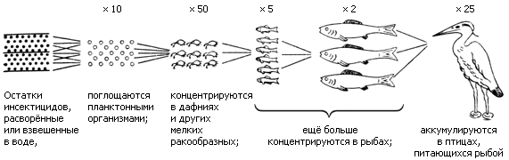Рис. 1. Накопление инсектицидов в пищевых цепях (Eichler, 1969)