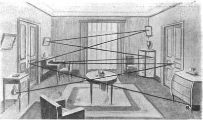«Инфракрасный сторож» охраняет комнату. Инфракрасный луч испускается лампой на столике слева — Е. Многократно отразившись и перегородив всю комнату невидимыми барьерами, луч попадает в приемник… под комодом справа. Малейшего затемнения луча в любом месте достаточно, чтобы робот поднял тревогу.