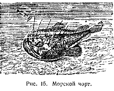 Другие хищники-рыбы, охотясь за пищей, прибегают к хитрости. Спокойно лежит на дне среди камней рыба, носящая название "морской чорт". На голове у него шевелятся усики. Набросится какая-либо рыбка на мнимого червяка и окажется в огромной пасти морского чорта. И плавать не надо, и пища сама в рот идёт!