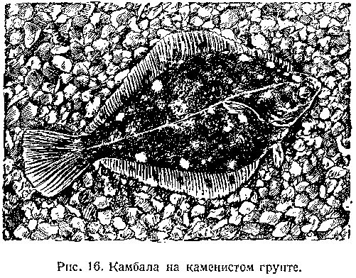 Замаскироваться, сделаться незаметным, очень выгодно в той непрекращающейся войне, которая ведётся в глубинах моря. Среди камней, совсем прижавшись ко дну, лежит плоская рыба камбала. Верхняя часть её тела окрашена под цвет окружающего грунта. Её совсем не видно. Более того, переплывёт камбала с песчаного грунта на каменистый и сразу изменится её окраска и расположение пятен на теле. На песчаном грунте рисунок мелкий, на каменистом станет пятнистым. В коже камбалы есть особые окрашенные клетки, которые могут подниматься к поверхности или погружаться в глубину кожи. При помощи этих клеточек быстро изменяется рисунок и цвет кожи камбалы, когда с одного грунта она попадает на другой. Так спасается от своих врагов беззащитная камбала. Проплыла акула, метнулась в разные стороны, зорким взором осмотрела дно и ничего не обнаружила. Всё притаилось, замаскировалось, словно и не было здесь минуту тому назад бурной жизни.