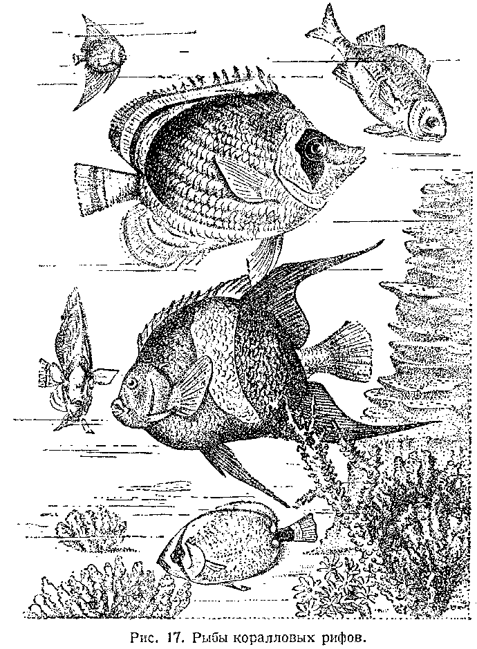 Среди веточек кораллов плавают пёстрые маленькие рыбки, несколько напоминающие бабочек своей окраской и формой тела. Пёстрые, ярко окрашенные, они бросаются в глаза в аквариуме, но становятся совершенно незаметными среди разнообразных кораллов. Военные маскировщики могли бы многому поучиться у рыбок коралловых рифов. То, к чему пришла военная наука, выработалось у этих рыбок давно в борьбе за существование.