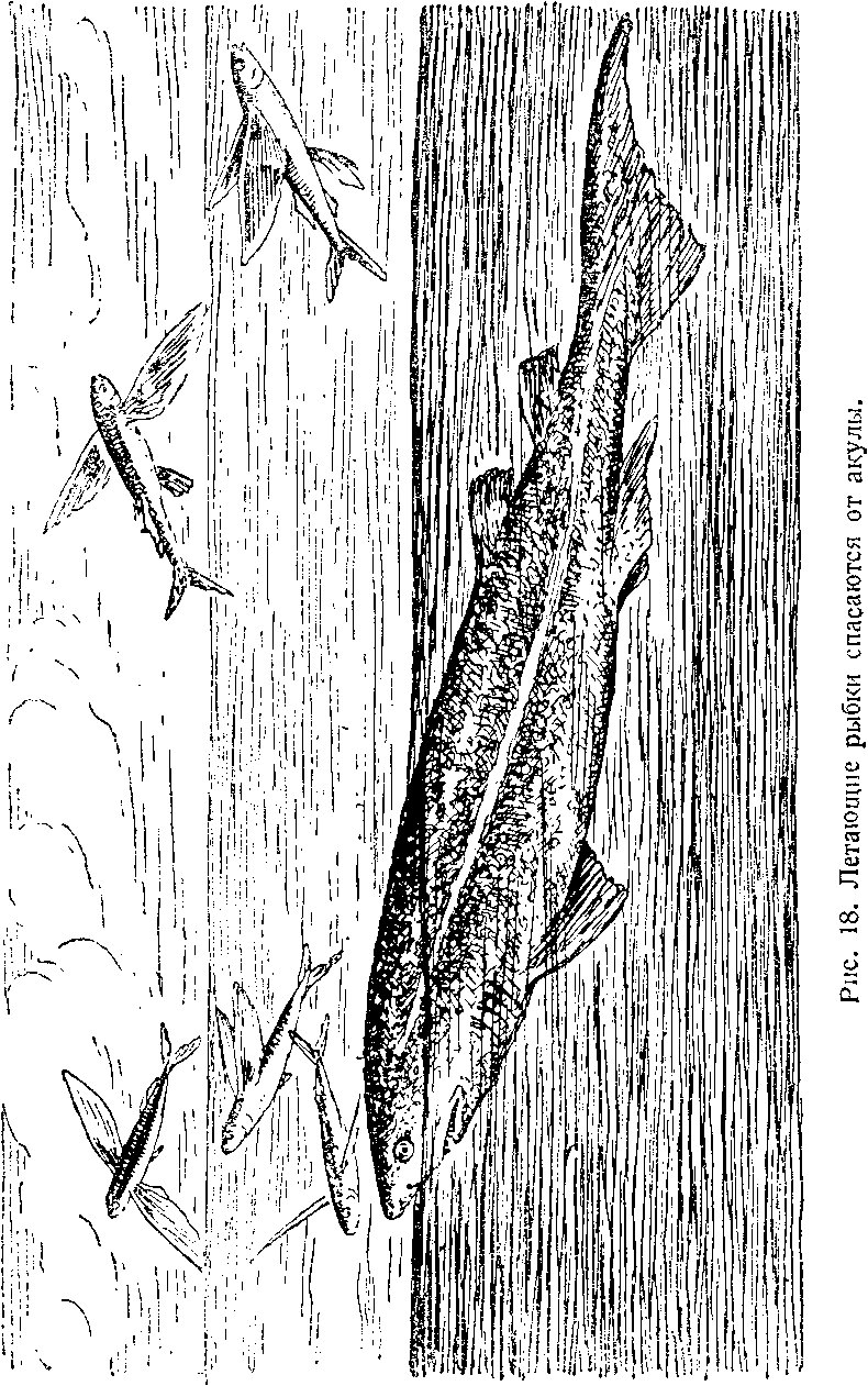 Что за странное явление? Точно стая воробьёв вспорхнула с волны и рассыпалась в разные стороны. Пролетели они несколько десятков метров, чуть прикоснулись к волне и быстро полетели дальше. Часть их даже залетела на палубу корабля. Это чудесные серебристые рыбки, грудные плавники которых превратились в крылья. Сколько прародителей этих летающих рыбок гибло из поколения в поколение, пока их плавники не развились в крылья, позволяющие им улететь от погони на сотню метров. Это выгодно им ещё и потому, что враг теряет направление погони. Но крыло рыбки — это крыло не птицы, а самолёта. Летающая рыбка не машет крыльями. Спасаясь от преследователя, рыбка быстро плывёт, работая хвостом, к поверхности моря. Крылышки-плавники прижаты к бокам туловища, всё тело устремлено вверх. Наконец, рыбка достигла поверхности. Как настоящий гидроплан, она быстро даёт разбег, затем расправляет встречному потоку воздуха крылья и взлетает. В воздухе она летит, как планёр. "Мотор" — её хвост, он работал в воде. Если нужно лететь дальше, рыбка коснётся волны, опять наберёт скорость и вновь взлетает.