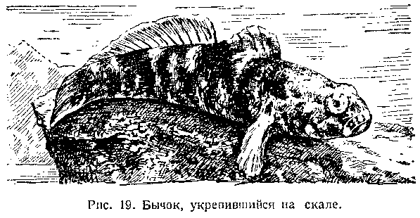 Сильная штормовая волна набегает на берег. В щепки разбиваются лодки, выворачиваются сваи, разламываются камни. Как в этих могучих волнах может сохраниться рыба? Ведь тело её не защищено панцырем. Мягкая кожа не выдержит удара о прибрежные скалы. Но даже в этой прибойной зоне моря живут рыбы. Брюшные плавники бычков видоизменились в особые присоски. Крепко присосавшемуся бычку не страшны идущие над ним волны. Замечательно приспособились к этим условиям некоторые бычки.
