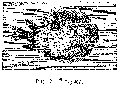Приспособилась к пассивному плаванию и ёж-рыба — "четырёхзуб". Она живёт у поверхности моря. Когда нет нужды плавать в погоне за едой, она наглатывает воздух и разбухает, как шар. Спокойно она предаётся пищеварению, пассивно плавая в воде. Но такая беспечность не может привести её к гибели. Защитой этой породе рыб служат или бесчисленные острые шипы, или ядовитые железы. Отведав такую добычу, ни один хищник не пожелает повторить попытку нападения на эту рыбку, казавшуюся такой беззащитной.