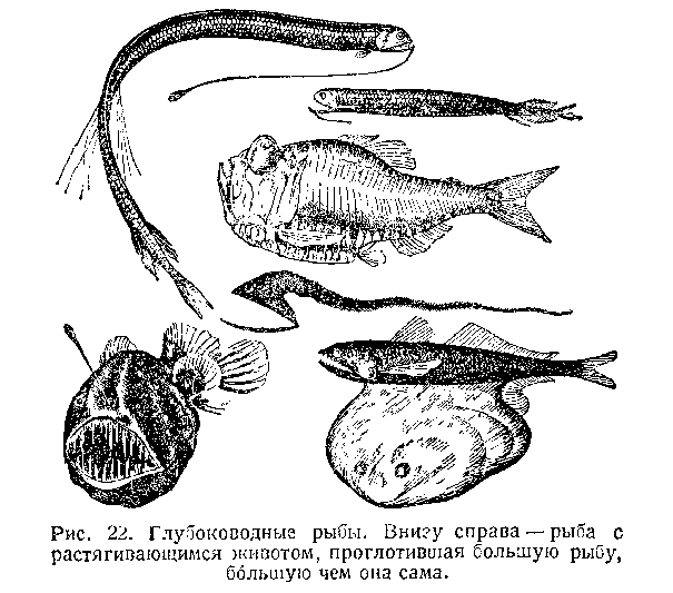 Огромны глубины океана, и на всех глубинах живут рыбы. Диковинных рыб вытаскивали сети исследователей с глубин более двух километров. Длинные щупальцы, змееобразная форма, необыкновенно зубастые рты. У одних рыб — светящиеся органы, громадные глаза, другие — совсем слепые. Самые разнообразные удивительные приспособления характерны для этих глубоководных рыб. Даже нарочно трудно было бы придумать таких чудовищ. На больших глубинах нет света, мало пищи, поэтому население там очень редкое. А борьба за существование продолжается и там — она неумолима. Чтобы настигнуть жертву, надо её увидеть. Собственный "фонарь" освещает хищнику путь. Длинные щупальцы ищут жертву. Нужны особенные глаза, чтобы что-нибудь увидеть в этой тьме. Простые глаза здесь бесполезны. Многие рыбы их утратили, стали слепые. Рты вооружены страшными зубами, от которых не ускользнёт редкая добыча.