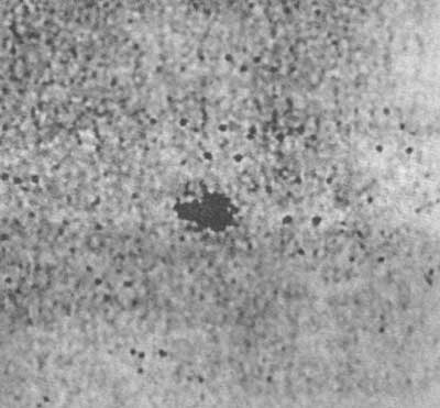 Рис. 52. Таинственный объект, сфотографированный Э. Герцшпрунгом 15 декабря 1900 г. (негатив). Было сделано 2 экспозиции со сдвижкой телескопа, так что объект и звезды дали по 2 изображения, смещенные по горизонтали и разнесенные приблизительно на 22 мин по времени.