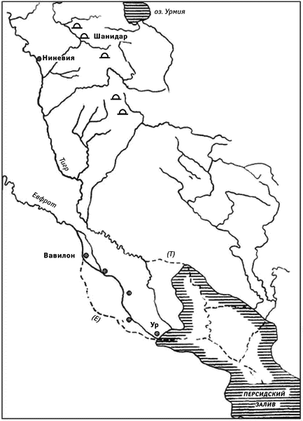 На схеме Месопотамии IV тыс. до н.э. значками оказаны пещеры (в том числе и Шанидар), пунктиром — современные русла рек Тигр и Евфрат