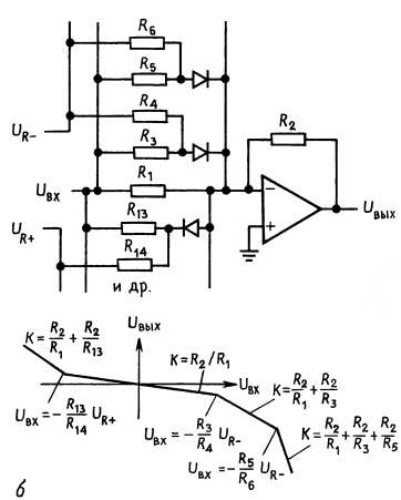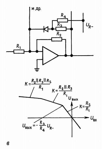 Рис. 4.94. б — инвертирующий усилитель с ломаной характеристикой; коэффициент усиления К увеличивается для входных сигналов, превышающих пороговое значение; в формулах пороговых значений предполагается, что Uдиод = 0; пороговое напряжение должно быть > 0,5 В;