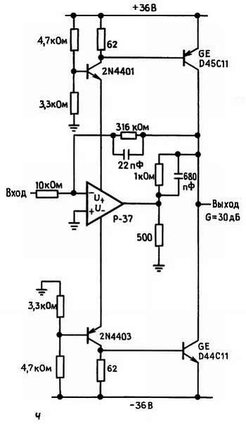 Рис. 4.95. б — выходной каскад на ОУ для усилителя звуковых частот со 100-кратным усилением;