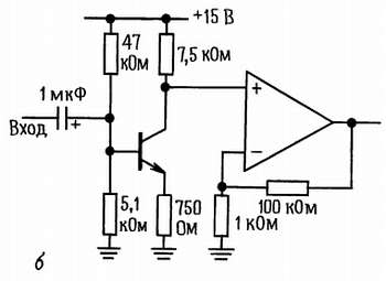 Рис. 4.95. ж — усилитель звуковых частот со 100-кратным усилением и однополярным питанием;