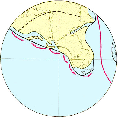 Положение литосферных плит и срединно-океанических хребтов в позднетриасовой эпохе.