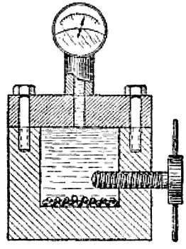 Возьмём очень крепкий металлический, лучше всего стальной цилиндр (рис. 5), насыплем на дно его немного дроби, наполним водой, укрепим крышку болтами и станем поворачивать винт. Так как вода сжимается очень мало, то долго крутить винт не придётся. Уже после нескольких оборотов давление внутри цилиндра поднимается до сотен атмосфер. Если теперь цилиндр охладить даже на 2–3 градуса ниже нуля, то вода в нём не замёрзнет. Но как в этом убедиться? Если открыть цилиндр, то при такой температуре и атмосферном давлении вода моментально превратится в лёд, и мы не будем знать, была ли она жидкой или твёрдой, когда находилась под давлением. Здесь нам помогут насыпанные дробинки. Когда цилиндр остужен, перевернём его вверх дном. Если вода замёрзла, дробь будет лежать на дне, если не замёрзла, дробь соберётся у крышки. Открутим винт. Давление упадёт, и вода обязательно замёрзнет. Сняв крышку, мы убеждаемся, что вся дробь собралась около крышки. Значит, действительно вода, находящаяся под давлением, не замерзала при температуре ниже нуля.