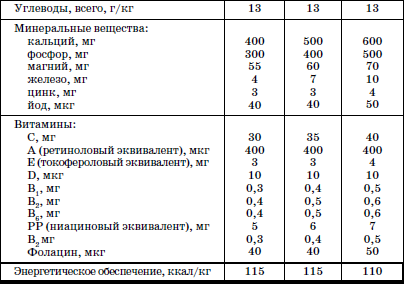 Введение большего количества белка и углеводов определяет высокую калорийность смесей (67–74 ккал/ /100 мл). «Последующие» формулы обогащаются железом до 1–1,3 мг/100 мл. Минеральный и витаминный состав отвечает потребностям детей второго полугодия жизни.