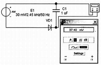 Приведенные выше цифры уровней мощности позволяют дать грубые оценки чувствительности детектора-сигнализатора, обнаруживающего превышение этих нормированных уровней и задать его характеристики в модели. Сигнал «утечки» задан здесь генератором Е1, работающим на прежней модельной частоте. К сожалению, какая-либо простая калибровка этого датчика не представляется возможной, но уж если он обнаруживает вблизи печи подобные сигналы, то следует принять необходимые меры. Особое внимание в конкретном устройстве надо обратить на диод: это должен быть именно СВЧ-диод (например, диод Шоттки), желательно с квадратичной ВАХ, чтобы показания были пропорциональны мощности.