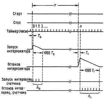 Используются три времязадающие схемы: главные эталонные часы, работающие непрерывно с периодом Т0, равным, например, 5 нc; входной импульс СТАРТ запускает второй генератор, период которого больше, чем период эталонного генератора в (1 + 1/n) раз (для нашего примера мы взяли n = 16); входной импульс СТОП запускает третий генератор с таким же периодом, как и второй запускаемый генератор. Быстродействующая схема следит за тем, когда произойдет совпадение импульсов запущенных генераторов и главных часов, и подсчитывает число импульсов (n1, n2), которые проходят до момента совпадения. Арифметический подсчет представлен вместе с диаграммами; интервал между импульсами СТАРТ и СТОП определяется с точностью до (1/n) — й длительности импульса главных часов.