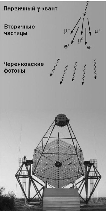 Чтобы наблюдать космическое гамма-излучение, как уже говорилось, аппаратуру приходится выводить за пределы земной атмосферы на космических аппаратах. Но и в космическом пространстве трудно зарегистрировать «сверхжесткие» гамма-кванты, энергия которых превышает 100 ГэВ. Это «сверхпроникающее» излучение способны задержать и обнаружить только детекторы размером в десятки и сотни метров. Для их запуска в космос даже нет достаточно грузоподъемной ракеты. К счастью, оказалось, что детектором для таких квантов может быть… атмосфера Земли! Ученые воспользовались тем обстоятельством, что гамма-квант сверхвысокой энергии, проходя через земную атмосферу, создает в ней ливень элементарных частиц. Каждая заряженная частица этого ливня, двигаясь с околосветовой скоростью (которая выше скорости распространения света в атмосфере), вызывает черенковское свечение. Поток оптических фотонов распространяется в том же направлении, что и породивший его гамма-квант. Остается только зарегистрировать этот свет с помощью обычного телескопа.