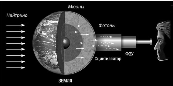Рис. 5.7. Схема обнаружения нейтрино, пронизывающего земной шар. Установка такого типа – в полном смысле слова «планета-телескоп».