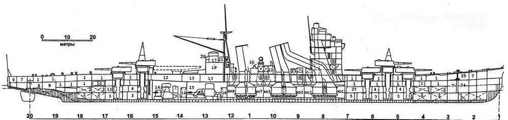 1- кубрики экипажа; 2 - топливные цистерны; 3 и 4 - зарядные и снарядные погреба ГК; 5 - погреба 12-см боезапаса; 6 - пост постановки дымзавес; 7 - кладовые риса и зерна; 8 - рулевой пост; 9 - отсек рулевой машины; 10 - холодильники и дистилляторные установки; 11 - распределительный электропост; 12 и 13 - торпедные отсеки; 14 и 15 - турбинные отделения; 16 - цистерна с i питательной водой для котлов; 17 - вспомогательный пост УАО ГК с директором типа 14; 18 - ангар для самолета; 19 - пост управления прожекторами; 20 - кормовой пост наблюдения; 21 - кормовая радиорубка; 22 - пост управления 12-см орудиями; 23 - мастерская; 24 - цепной ящик; 25 - отсек привода шпиля; 26 - места для 13-мм пулеметов; 27 - пост телеграфа; КО - котельные отделения; В - шахты вентиляторов