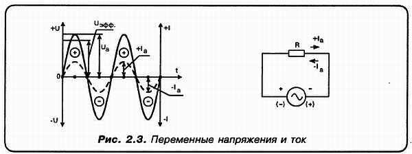 «А»: Переменный ток имеет (что естественно) свою причину. И эта причина — переменное напряжение! То есть это такое напряжение, величина и полярность которого имеют периодический характер в функции от времени. Да вот, посмотри на рисунок (рис. 2.1).